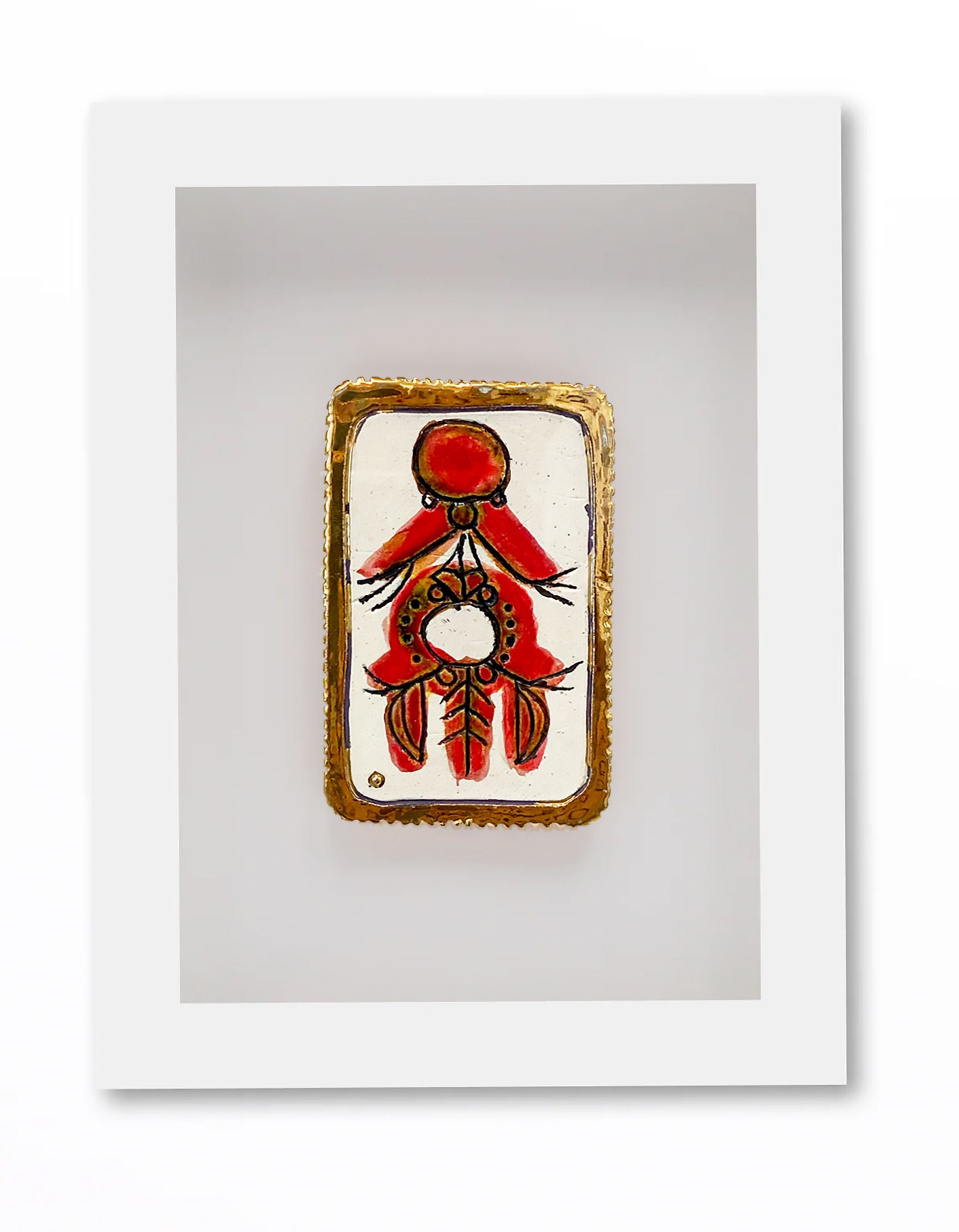 The ceramic and gold-framed “Game” pieces function like collectible cards or talismans within the larger installation— portable fragments of memory that distills the exhibition's visual language into a single, intimate object meant to be held and carried.