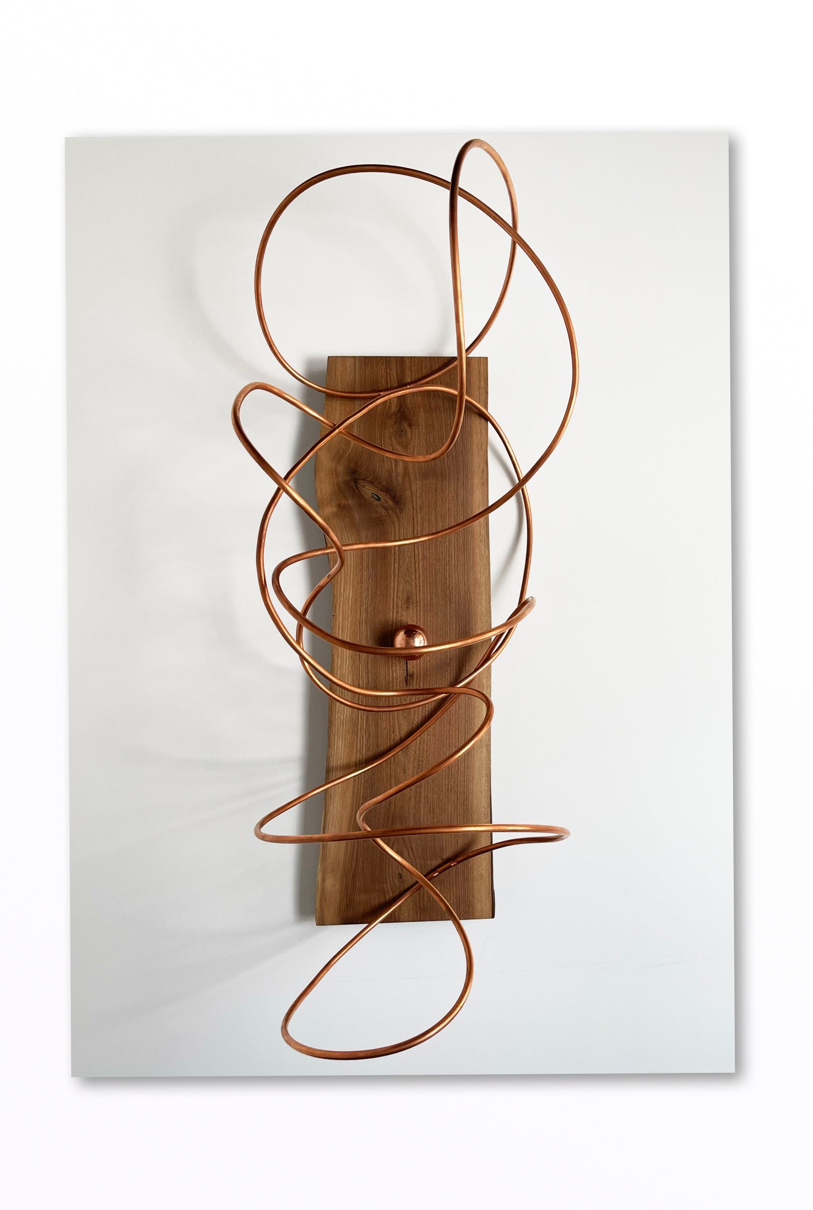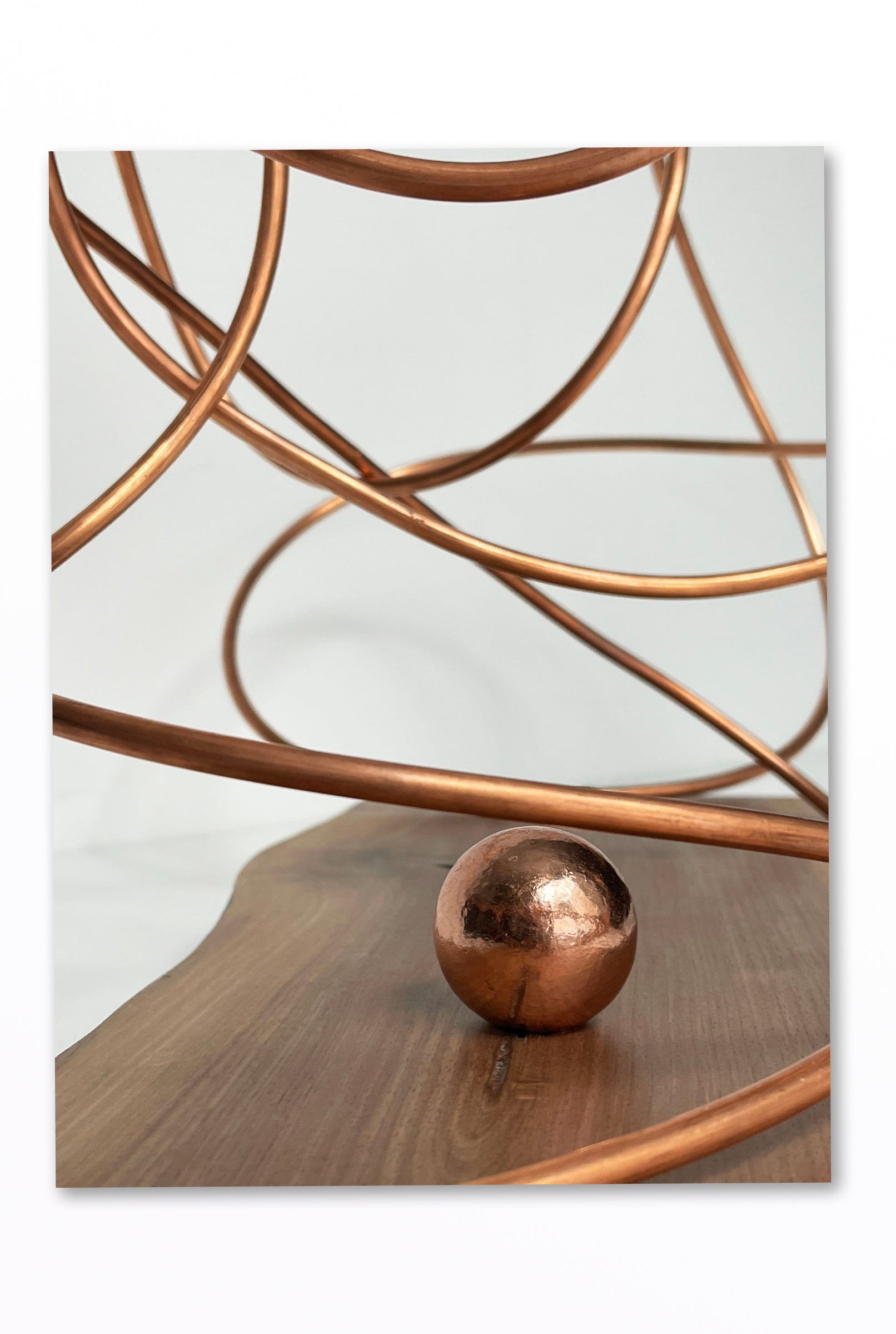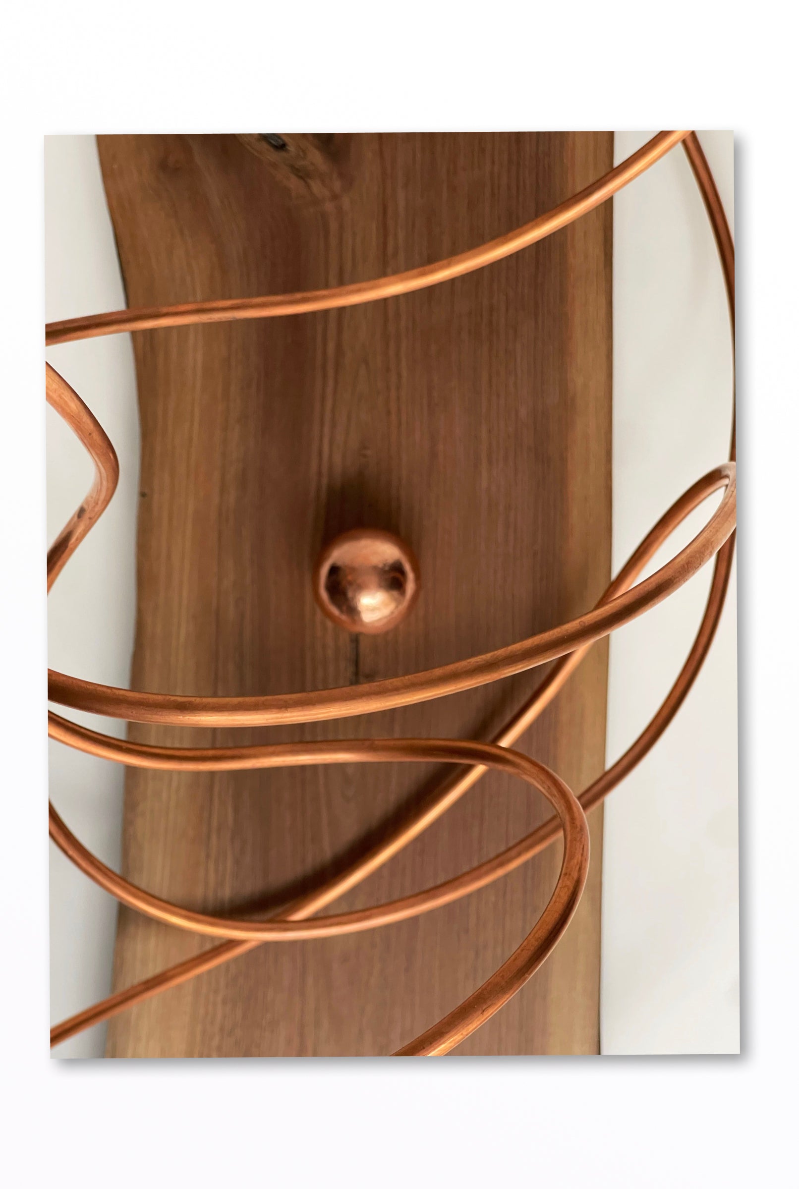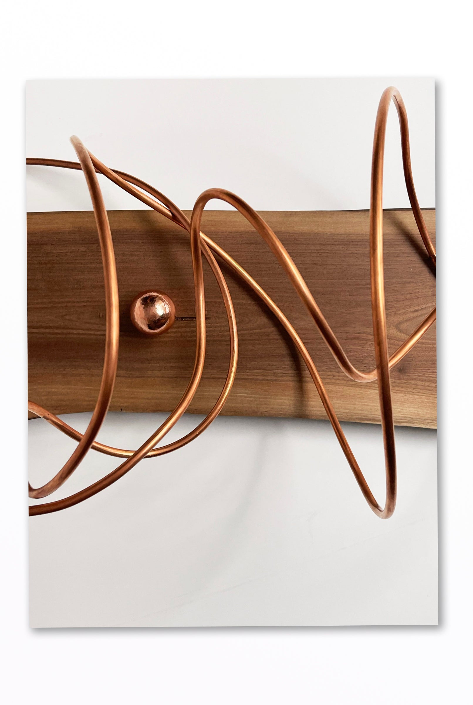 Made to work as both a wall-hanging or table sculpture, this form invites curiosity from every angle. The copper catches the light and shifts as you move past it. Notice the shadows it casts against the nearby surfaces and how it plays with the light. The walnut keeps it rooted, organic, and honest. Freedom and grounding. Motion and pause. Wild fun, beautifully held.