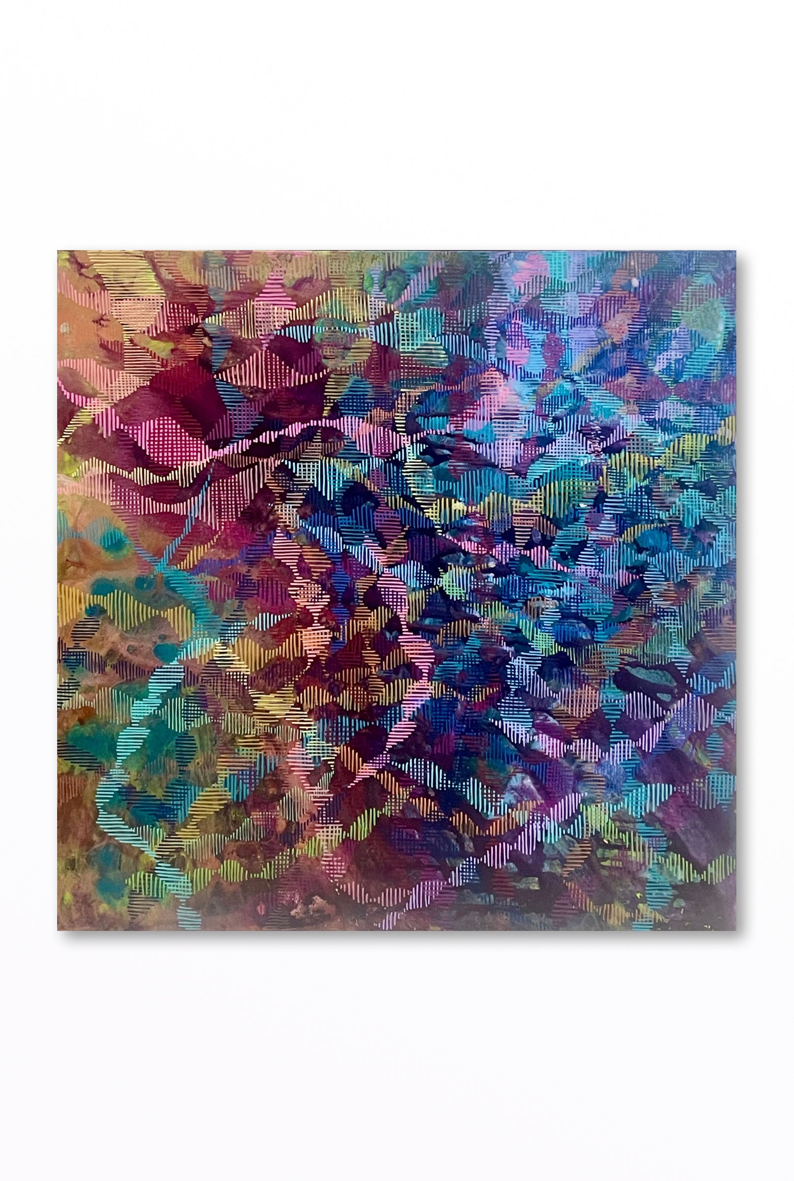 Built with saturated color and interwoven linework, 'Deepest Desires' delves into the emotional terrain of longing, vulnerability, and our inner callings. Layers of translucent pigment and rhythmic patterns form a tapestry that hints at the complexity beneath the surface. This work offers a visual map of the intricate pathways we follow in pursuit of our most personal truths.