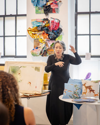 Embroidery artist Young Yang Chung, this year’s featured artist at the Larchmont Arts Festival, joined us for an illuminating conversation on her practice and the enduring legacy of embroidery as fine art. Through exquisite samples and generous dialogue, she invited guests to see the medium’s intricate craftsmanship and contemporary relevance anew. Young’s influence extends across continents—her eponymous museum in Seoul celebrates decades of groundbreaking work, while her pieces grace the collection of The Metropolitan Museum of Art in New York.